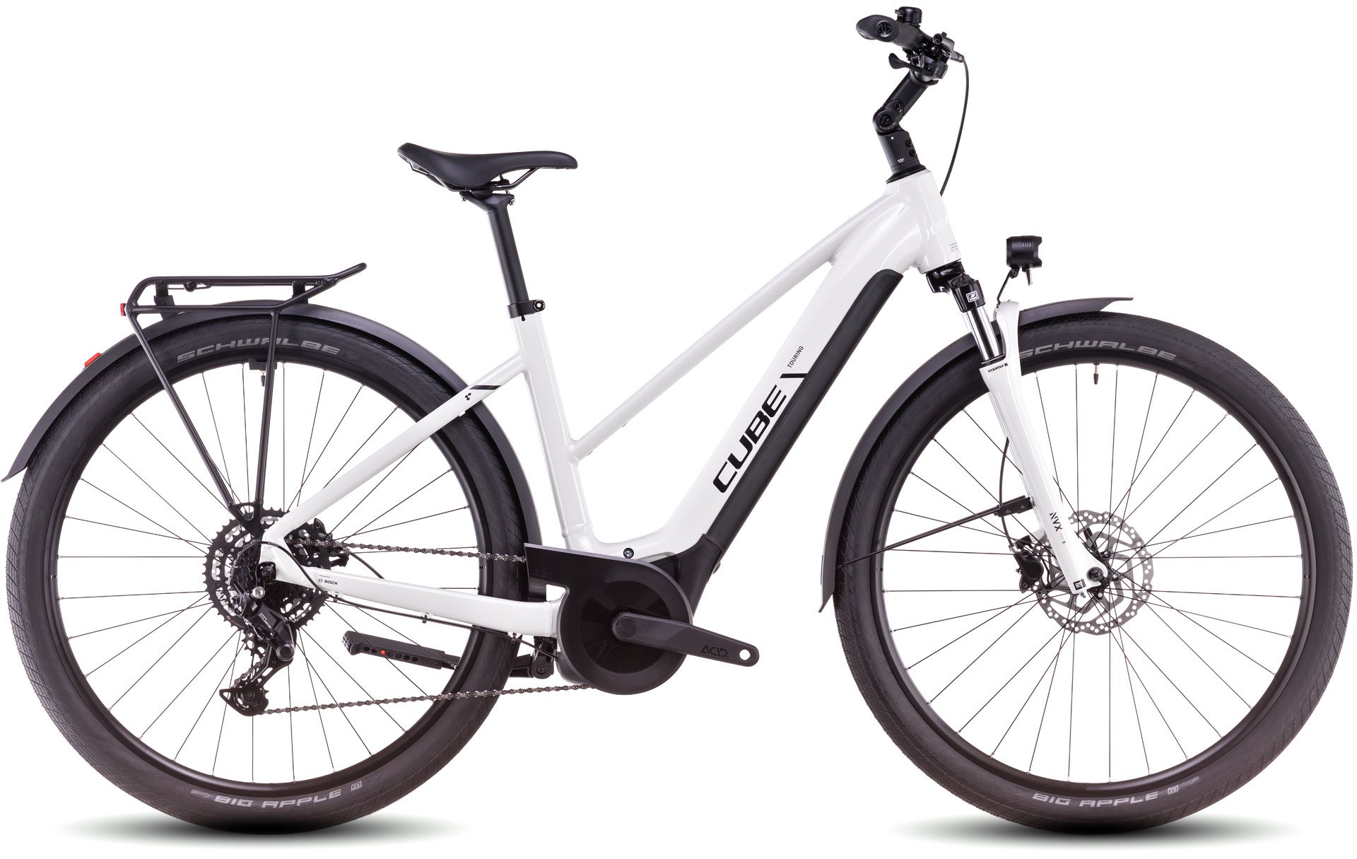 Auf den ersten Blick sieht der Touring Hybrid Trapezrahmen vielleicht unspektakulär aus, doch wer genau schaut, wird von seiner Ästhetik und Detailverliebtheit und damit seinem tollen Handling begeistert sein. Wir haben den leistungsstarken Bosch Performance Motor und den 625 Wh PowerTube Akku nämlich so formschön ins Design integriert, dass er kaum auffällt. Was aber natürlich auffällt, ist der tolle Support im Vorwärts! Auf dem Gepäckträger findet sämtliches Hab und Gut Platz. Dazu kommen ein Kettenschutz und Schutzbleche, damit die Kleidung sauber bleibt, und ein praktischer Seitenständer zum Abstellen. Mit ihren 63 mm Federweg sorgt die Federgabel für ein komfortables und zugleich kontrolliertes Fahrgefühl, selbst auf holprigen Strecken. Apropos Komfort: Unsere Efficient Comfort Geometry macht ihrem Namen alle Ehre und fährt sich selbst nach vielen Stunden im Sattel immer noch angenehm bequem.