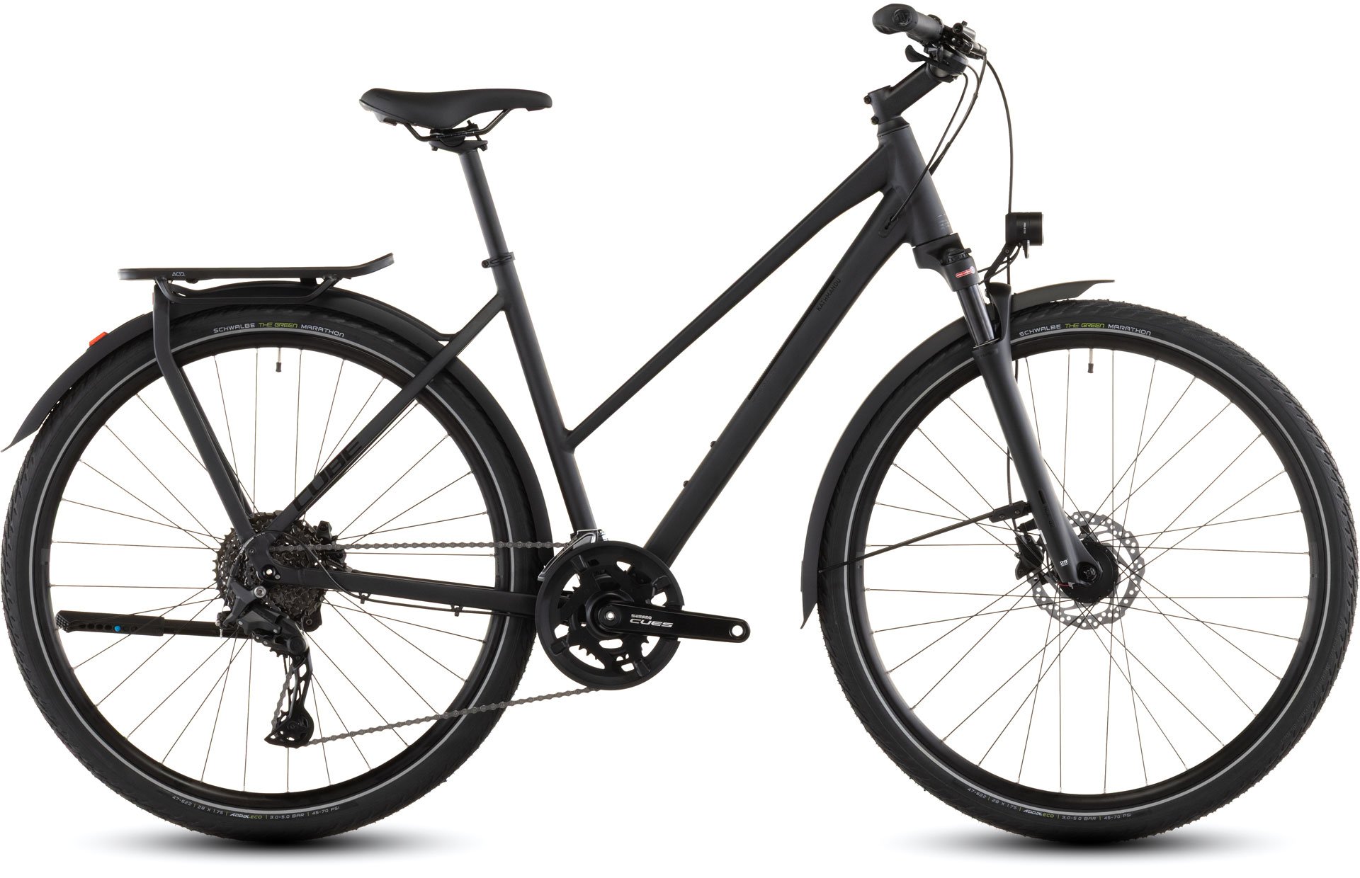 Der Trapezrahmen des Kathmandu aus dem Hause CUBE ist ein Sinnbild für klassische Eleganz! Der integrierte Gepäckträger IC 3.0 geht nahtlos und formschön in unsere ACID Schutzbleche über. Dazu gibt's am Hinterrad Aufnahmen für eine Flat Mount Scheibenbremse und einen Seitenständer. Seine cleane, aufgeräumte Optik verdankt das Chassis den im Smooth Welding Verfahren gestalteten Rohrverbindungen und im Unterrohr verlaufenden Zügen. So viel zum Aussehen. In Sachen Funktion haben wir den Hinterbau mit einer Steckachse versehen und ein konisches Steuerrohr für optimierte Stabilität und Lenkpräzision (selbst bei voller Beladung) verbaut. Also alles da, was es auf Tour braucht – den Rest machst du!